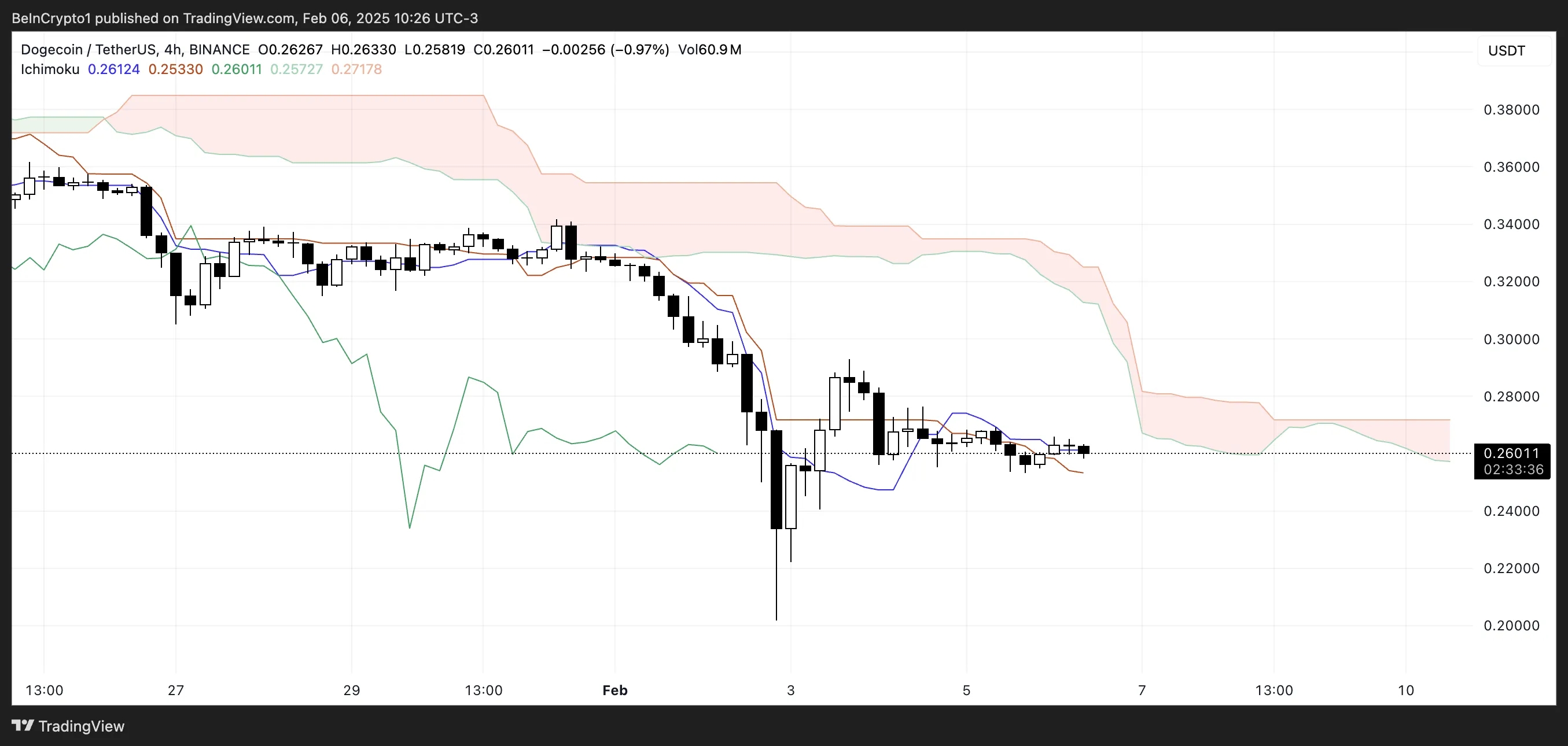 На дневном графике Dogecoin видно, что линия курса его цены расположилась ниже облака Ишимоку. При этом само облако остается красным и наклоненным вниз — это указывает на то, что уровни сопротивления в ближайшее время будут оставаться крайне сильными, а медвежий импульс, вероятно, продолжит доминировать на рынке мемкоина.
