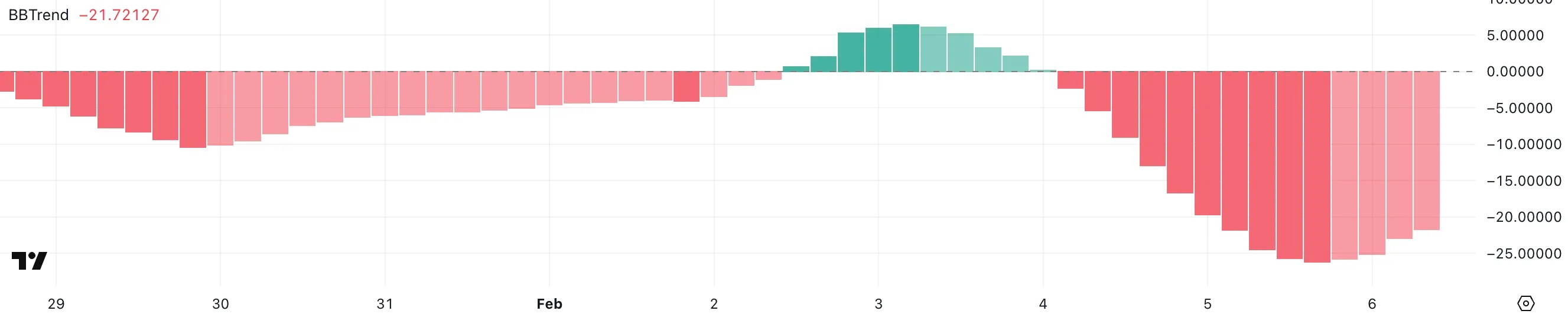 Тем временем BBTrend для токена остается отрицательным последние два дня и на момент публикации составляет -21,7. Вчера индикатор находился заметно глубже в отрицательной зоне — на отметке -26,1.   Такая динамика сигнализирует о том, что медвежий импульс начинает ослабевать, хотя на данный момент все же продолжает доминировать. Если BBTrend продолжит расти, то перспектива консолидации или прорыва станет более вероятной.