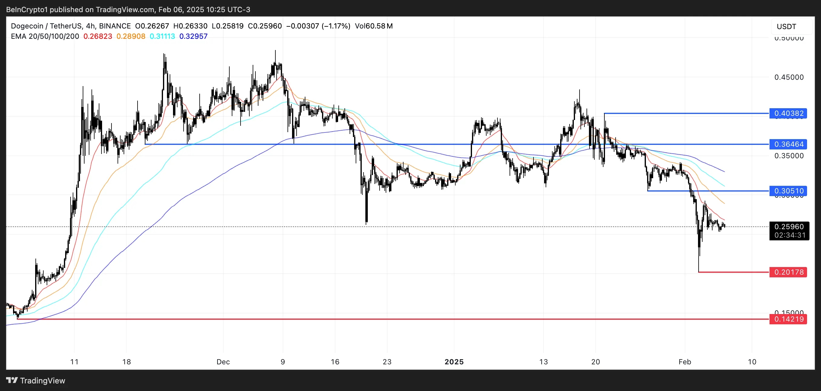 На момент написания этого анализа DOGE торгуется по $0,2507. Падение мемкоина за последние сутки составило 4,5%.